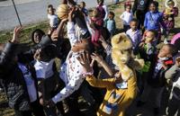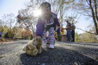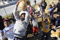Cliff Williams / The Outlook Jamoria Crayton, 4, of Alexander City picks up a teddy bear tossed to her by Santa. As the Alexander City Fire Department and the Alexander City Parks and Recreation Department partnered with Santa Monday to bring a little cheer to Alexander City Monday. Santa visited many areas of the city passing out teddy bears, balls and hats. The fun continues Tuesday in areas Santa didn’t visit Monday.
