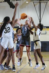 Cliff Williams / The Outlook Stanhope Elmore’s Ariel Gilchrist fights with Wetumpka’s Zariah Fannin and Janae McCall for a loose ball.
