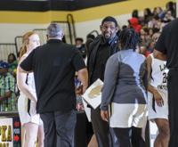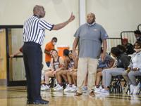 Cliff Williams / The Outlook Wetumpka coach Jeremy Bell speaks with his team during a timeout against Stanhope Elmore.