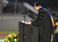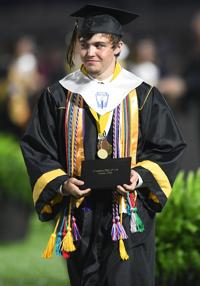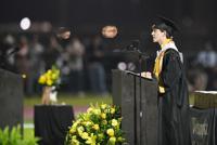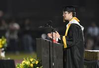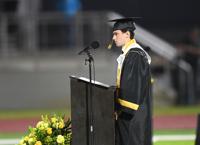 Cliff Williams / The Herald The Wetumpka High School Class of 2023 Valedictorian Brad Mann speaks Tuesday. The group of graduates didn’t let a little rain stop their graduation. Instead they paused for an hour and let the rain pass before being honored in front of family and friends.