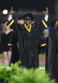 Cliff Williams / The Herald The Wetumpka High School Class of 2023 class president Gavan Baxley speaks Tuesday. The group of graduates didn’t let a little rain stop their graduation. Instead they paused for an hour and let the rain pass before being honored in front of family and friends.