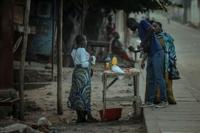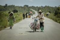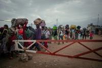With rifles at their feet, Burundian soldiers watch from behind barriers as more than 500 of their compatriots cross the Kavimvira border, returning home.