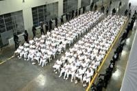 Seated in neat columns of plastic chairs in the prison's main hall, some 220 defendants are accused of collectively carrying out more than 29,000 murders.