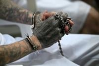 Hundreds of alleged Mara Salvatrucha gang members sat chained, shaved and mute as they were accused of murder and torture during a mass trial at El Salvador's notorious CECOT jail, AFP reporters witnessed Thursday.