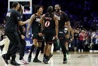 Andre Drummond celebrates a three-pointer with Philadelphia 76ers teammates Tyrese Maxey and Kelly Oubre Jr. during the Sixers' NBA play-in victory over the Orlando Magic
