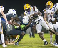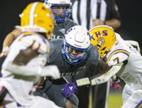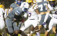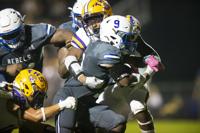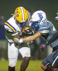 Cliff Williams / The Tribune Tallassee’s Joseph Hooks (2) tries to break the tackle of Reeltown’s Tae Martin (12).