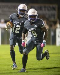 Cliff Williams / The Tribune Reeltown’s Tae Martin (12) runs behind the block of Arthur Woods (9).