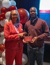 Alexander City Schools superintendent Dr. Beverly Price, left, presents Scott Hardy the Wildcat Award. Alexander City Schools named him as the award recipient Tuesday at the school system’s convocation.Â