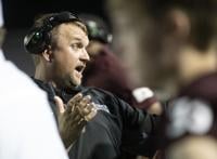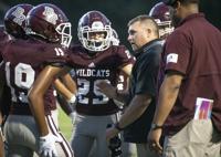Cliff Williams / The Outlook Ben Russell coach Aubrey Blackwell speaks with his team in a huddle as they play Huffman Friday at the Charles E.…