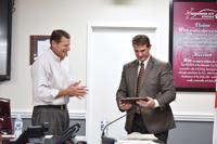 A white ribbon marks the empty chair of late Alexander City Mayor Jim Nabors as the city council meets Monday evening for the first time since…