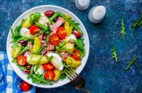 Nicoise salad with canned tuna, tomatoes, boiled eggs, green beans, potatoes and olives on white plate, blue table background, top view Olga Kochina Aug 18, 2023 Chicken or Tuna Nicoise Salad Buy Now