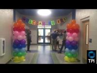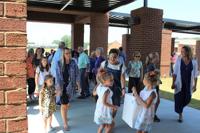 Students rushed toward to school's entrance as the tour began, anxious to explore the new school.