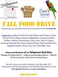 News Featured Fall food drive returns to Dadeville Staff Report Updated Aug 2, 2025 For this holiday season, Tallapoosa Nutrition and Zazu’s Verandah have partnered together for the fall food drive.Â