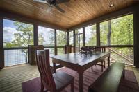 The porch features an outdoor dining table made from old barn wood.
