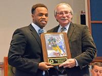 Auburn head football coach Hugh Freeze holds up a Freeze jersey with newly appointed associate head coach Cadillac Williams and athletics dire…