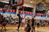 Klark James flies for a layup, in front of his 1,000 celebratory banner. Feb. 03, 2023.