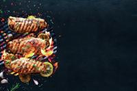 Grilled chicken breasts on a grill plate on black background with copy space, top view. Bbq background Zbigniew Lewczak Jun 10, 2021 Buy Now