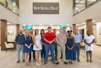 Cliff Williams / TPI Cadence Hill and the other recipients of the William Buechner Memorial Scholarship pose for a photograph with staff of Tr…
