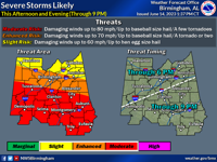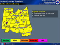 News Featured Severe weather predicted for Sunday TPI Staff Jul 7, 2023 The National Weather Service issued a slight risk across Central Alabama for this Sunday.