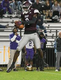 Receiver Malcolm Simmons flies in the air for a catch against Hueytown. Simmons caught two touchdowns.