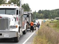 A tow truck readies a log truck for removal after the log truck broke down on Highway 22 near Highway 9 Thursday. The truck had a fuel leak an…