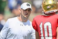 Sports NCAA Football: Notre Dame Spring Game Matt Cashore-USA TODAY Sports Feb 2, 2023 Apr 23, 2022; Notre Dame, Indiana, USA; Notre Dame Fighting Irish offensive coordinator Tommy Rees talks to quarterback Drew Pyne (10) during …