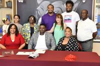 Onaje Brooks (seated center) is surrounded by family and Martae Wycoff (standing third row left) during his signing day event Tuesday. (Darius…