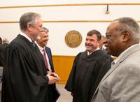 Cliff Williams / TPI New Elmore County District Court Judge Ben Baxley, center, speaks with guests following his investiture ceremony Friday.