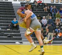 Samuel Higgs / TPI Reeltown's Devin Bragg, right, picks up Benjamin Russell's Ca’Zavion Edward-Davis for a takedown. Bragg sits at 24-2 this season and hit the 100 pin milestone in his wrestling career.