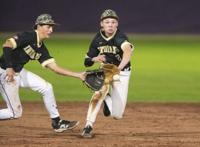 Cliff Williams / TPI Wetumpka’s Connor Jacks (13) and Peyton Dickey (2) go for a ground ball against Tallassee.