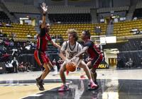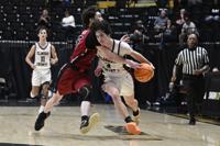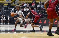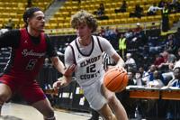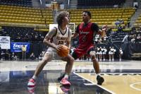 Ana Sofia Meyer / TPI Elmore County guard Seth Davis attempts to get the Panthers into their transition offense as his Sylacauga defender steps up to stop his progress down the floor.