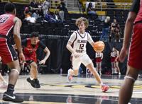 Ana Sofia Meyer / TPI Elmore County's Gage Davis avoids a steal against Sylacauga in the Panther's first Sweet 16 appearance in 35 years.