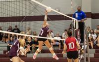 Ana Sofia Meyer / TPI Elmore County's Isabella Fuller (9) swings her arm for a kill against Horseshoe Bend on Tuesday night at Elmore County High School.