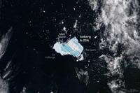 When the MODIS (Moderate Resolution Imaging Spectroradiometer) on NASA's Terra satellite captured this image of what remained of the waterlogged berg on December 26, 2025, extensive pools of blue meltwater were visible on its surface. (NASA Terra satellite/MODIS via SWNS)