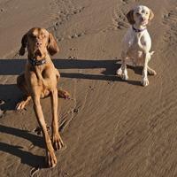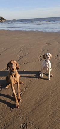 The dogs being walked while 2,000-year-old human and animal footprints were found at Lunan Bay in Scotland. (University of Aberdeen via SWNS)
