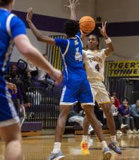 Ana Sofia Meyer / TPI Tallassee guard Jaiden Gordon (1) fakes a pass as he drives the lane and pulls up for a jump shot in a non-area loss to Beauregard on Thursday night.