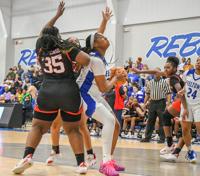 Samuel Higgs / TPI Reeltown's Sarenthia McKethern, right, fights her way through multiple defenders to get points. She finished with a team-high 16 points and 17 rebounds against Loachapoka.