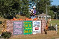 The Tallassee Chamber of Commerce and its volunteers decorated the sign at Five Points and brought some life and a little rumpus to the normally traditional fall display. Volunteer Vanessa Farmer and her dog Taco were involved in bringing the fall decorations to life.