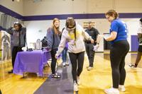 Cliff Williams / TPI Tallassee senior Sarah Jane Patterson gives the drunk glasses at the Tallassee Police Department booth a try Friday. Every student including Patterson could not walk a straight line with the goggles designed to mimic how it feels to be drunk.