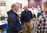Cliff Williams / The Tribune Tallassee Rehab owner Tom Crain, right, greets Tallassee Chamber of Commerce Director Jerry Cunningham in the gym are of the business Monday. Tallassee Rehab is celebrating 25 years of business.