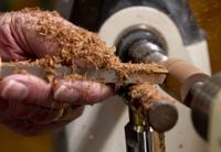 Cliff Williams / The Tribune Wood chips come off a piece of walnut as David Thornton turns a pen in his shop recently. Thornton has been turning pens for about 10 years and has created about 1,000 of them.
