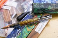 Cliff Williams / The Tribune David Thornton jokes this is the world’s most expensive shop pen. It is made from rattlesnake skin in resin. The pen is not salable because the barrel cracked as Thornton was pressing in the components. Thornton has been turning pens for about 10 years and has created about 1,000 of them.