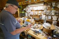 Cliff Williams / The Tribune David Thornton uses several different grits of sandpaper to smooth the wood after removing the bulk of the wood with a lathe tool. Thornton has been turning pens for about 10 years and has created about 1,000 of them.