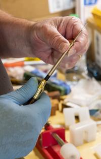Cliff Williams / The Tribune David Thornton applies sand-and-sealer to a walnut barrel for a pen. The finish allows the natural colors and grain of the wood to be highlighted. Thornton has been turning pens for about 10 years and has created about 1,000 of them.
