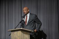 Cliff Williams / TPI Dr. Catherine James-Peters’ husband Junius Peters speaks at the Tallassee High School Alumni Association’s Hall of Pride induction ceremony for his wife.