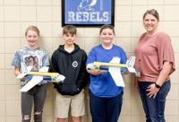 Sarah Chase / TPI Leighanna Grice, right, with her students Gage Coan, Hamilton Hobbs, Raylee Ragsdale and their coroplast airplane models.