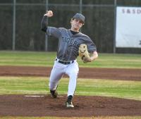Samuel Higgs / TPI Dadeville's Cale Hanks fires a pitch to homebase in the Tigers' season opener against Reeltown. Hanks made an appearance on the mound in all three of Dadeville's games.