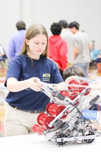 Submitted / TPI Robotics team secretary Janet Montgomery adjust the robot before the third round of the competition.