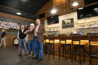 Cliff Williams / TPI Millbrook Mayor Al Kelley, right, speaks about the importance of Big Mike’s Steakhouse locating in Millbrook. Behind him is a custom live-edged bar made from a cypress from a Coosada swamp. To the left is a display featuring photographs from local veterans.