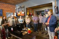 Cliff Williams / TPI Wetumpka Mayor Jerry Willis, right, speaks at the ribbon cutting for The Bailey Boutique on Bridge Street in downtown Wetumpka. The story offers guitars, amps, keyboards and more. It also includes Alabama Audio Visual and Four Star Backline.